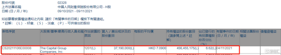 根据联交所最新权益披露资料显示,2021年11月4日,中国财险遭The Capital Group Companies, Inc.以每股均价7.09港元减持3719万股,涉资约2.64亿港元。