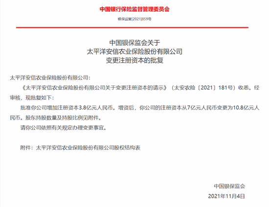 11月11日消息,中国银保监会公开关于太平洋(3.240, 0.05, 1.57%)安信农业保险股份有限公司变更注册资本的批复。经审核,批准你公司增加注册资本3.8亿元人民币。