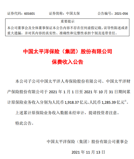 11月12日消息,中国太保(28.200, -0.20, -0.70%)公告,公司子公司中国太平洋(3.230, -0.01, -0.31%)人寿保险股份有限公司、中国太平洋财产保险股份有限公司于2021年1月1日至10月31日期间累计原保险业务收入分别为人民币1918.37亿元、人民币1285.39亿元。