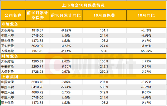寿险业务方面,中国人寿(29.360, 0.15, 0.51%)、新华保险(38.660, 0.24, 0.62%)今年前10月累计原保费分别为5748亿元、1473.78亿元,分别同比增长1.58%和1.53%。而太保寿险、平安寿险和人保寿险今年前10月累计原保费分别同比下降0.92%、3.63%以及2.41%。
