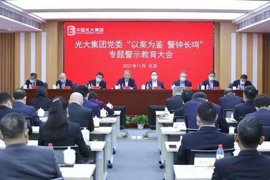 11月23日,光大集团在光大中心召开“以案为鉴 警钟长鸣”专题警示教育大会,深入贯彻落实党中央全面从严治党要求,持续抓好集团系统党风廉政建设和反腐败斗争工作,进一步推进以案促改、以案促治、以案促建,推动警示教育常态长效。
