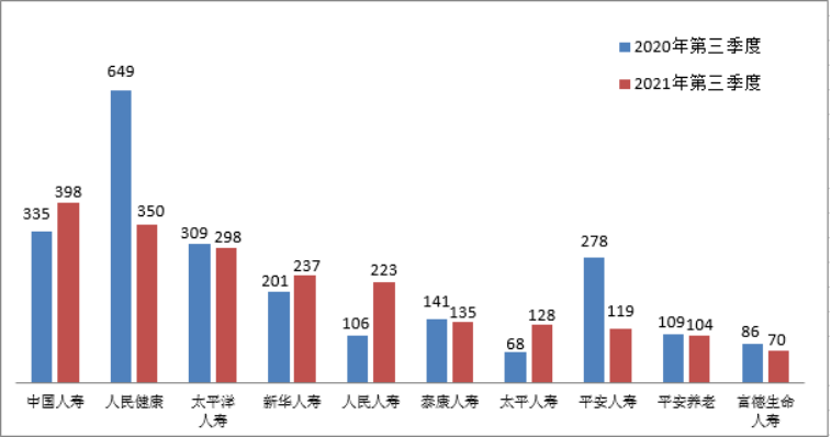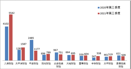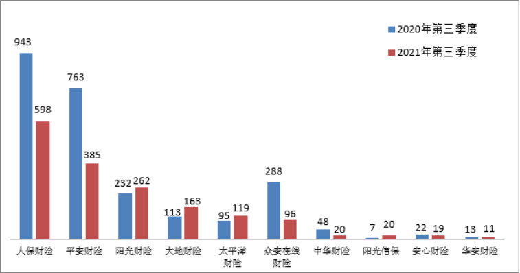2021年第三季度,中国银保监会及其派出机构接收并转送涉及保险公司的保险消费投诉同比增长18.35%,人保财险和平安人寿分别位列财产保险公司和人身保险公司第一,机动车辆保险和普通人寿保险分别是财产保险公司和人身保险公司投诉最多的险种,理赔纠纷和销售纠纷是消费者反映集中的问题。