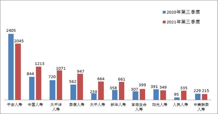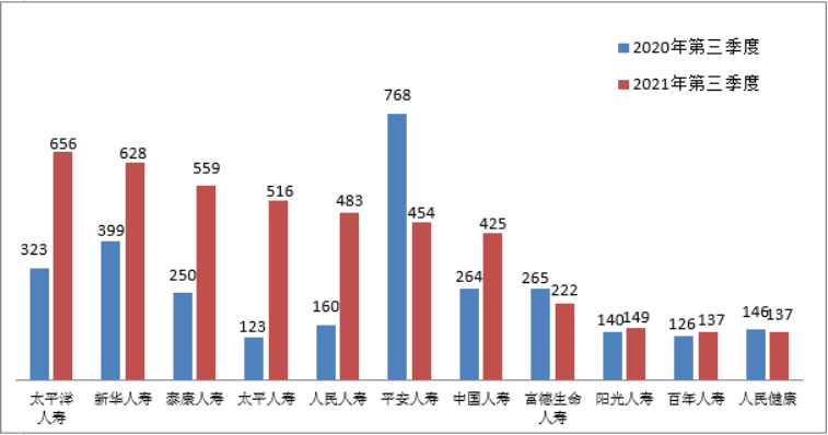 2.信美相互人寿、华汇人寿的万张保单投诉量位列人身保险公司前两位。2021年第三季度,人身保险公司万张保单投诉量中位数为0.28件/万张。其中,万张保单投诉量居前10位的为:信美相互人寿1.70件/万张;华汇人寿1.63件/万张;中意人寿1.18件/万张;长生人寿1.01件/万张;中韩人寿0.84件/万张;瑞泰人寿0.79件/万张;富德生命人寿0.73件/万张;中华人寿0.66件/万张;陆家嘴(10.570, 0.13, 1.25%)国泰人寿0.65件/万张;爱心人寿0.64件/万张。
