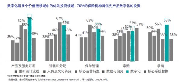 毕马威的调查显示,数字化是价值链中一个突出的优先投资领域,76%的保险机构将优先对产品数字化进行投资,突显了颠覆性技术的影响力。