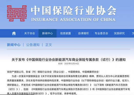 21世纪经济报道记者杜巧梅 报道 12月14日,中国保险行业协会(以下简称“保险业协会”)官网披露消息称,为充分发挥保险保障功能,服务国家“碳达峰、碳中和”战略目标,支持国家新能源汽车产业发展,在银保监会的指导下,保险业协会认真落实《关于实施车险综合改革的指导意见》工作部署,开发完成行业《新能源汽车商业保险专属条款(试行)》(以下简称《条款》)。