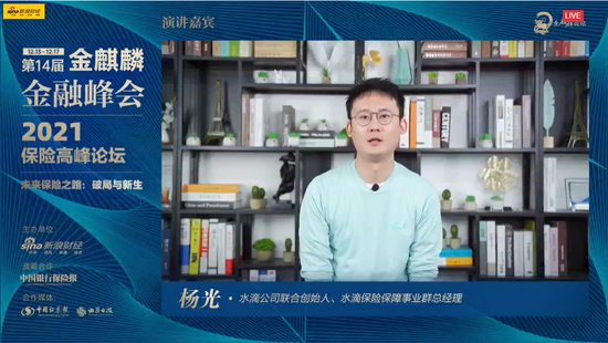 12月14日消息,由新浪财经主办的“第14届金麒麟(12.590, 0.51, 4.22%)金融峰会”于12月13日-17日隆重举行,主题论坛“2021金麒麟保险高峰论坛”今日召开。水滴公司联合创始人、水滴保险保障事业群总经理杨光在论坛上发表了题为《互联网保险的变与不变》的主题发言。