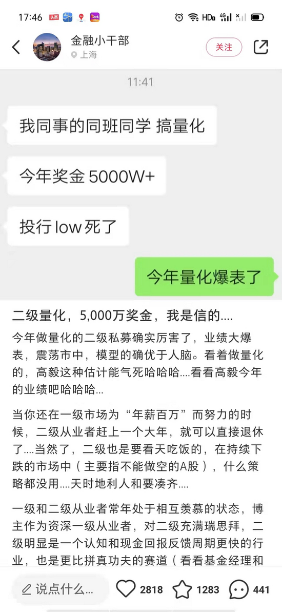 对此有网友表示,量化二级市场奖金达到千万属于正常现象,因为二级市场更考验能力、见识、认知,同时,“比IT程序员还费头发”。