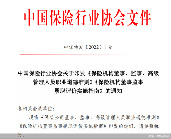 继银保监会出台《银行保险机构董事监事履职评价办法(试行)》后,1月12日,北京商报记者独家获悉,中国保险行业协会(以下简称“保险业协会”)针对保险机构发布了《保险机构董事监事履职评价实施指南》(以下简称《实施指南》)和《保险机构董事、监事、高级管理人员职业道德准则》(以下简称《职业道德准则》)。
