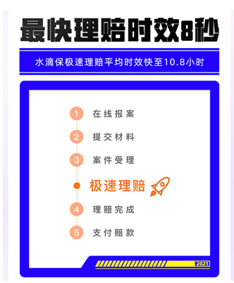 在用户关心的理赔方面,水滴保持续加大投入,致力于为用户提供“赔付快、更靠谱”的理赔体验。2021年9月,水滴保对理赔系统进行了升级。水滴保平台上,申请赔款金额在1万元以内、材料齐全且事故责任明确的理赔案件,将自动进入“极速理赔”服务通道。水滴保联动保险公司提供整套服务支持,以确保在1-3个工作日内向上述案件类型用户出具理赔结论。同时新增“智能预测结案时间”功能,最大程度减少用户等待过程中的焦虑感。
