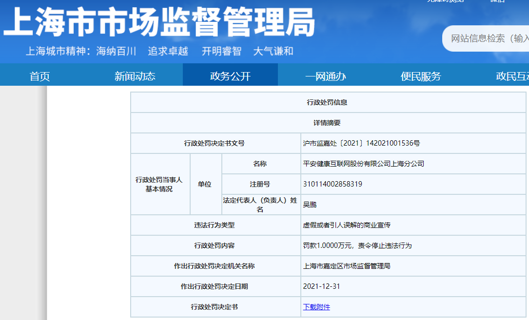 中国经济网北京1月13日讯 上海市市场监督管理局网站近日公布的行政处罚决定书(沪市监嘉处〔2021〕142021001536号)显示,平安健康互联网股份有限公司上海分公司因存在虚假或者引人误解的商业宣传违法行为,被上海市嘉定区市场监督管理局罚款1万元。
