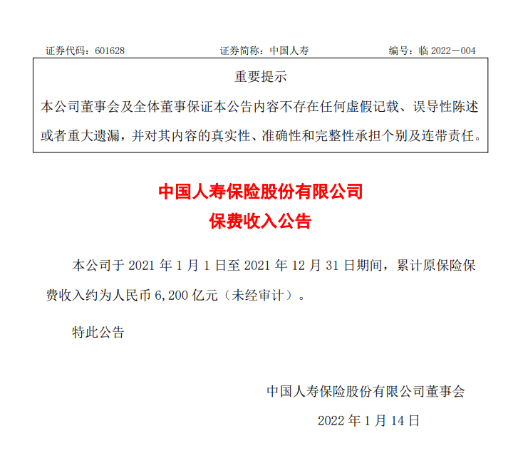 1月14日,中国人寿(29.000, -1.03, -3.43%)公告,2021年累计原保险保费收入约为6200亿元。本公司于2021年1月1日至2021年12月31日期间,累计原保险保费收入约为人民币6200亿元(未经审计)。