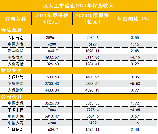 五大上市险企2021年揽入保费2.49万亿元 同比微增0.03%