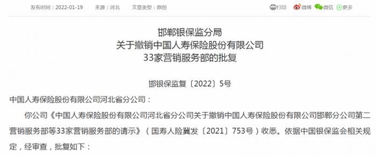 1月19日,邯郸银保监分局同意批复了 《中国人寿(29.760, 0.60, 2.06%)保险股份有限公司河北省分公司关于撤销中国人寿保险股份有限公司邯郸分公司第二营销服务部等33家营销服务部的请示》。根据记者不完全统计,今年开年以来,各家险企已经撤销近50家网点。