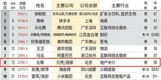 2020年7月,贝壳找房上市,贝壳集团创始人左晖持股28.9%,为第一大股东。