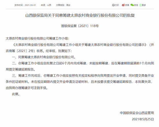 6月3日消息,中国银保监会山西银保监局公示关于同意筹建太原农村商业银行股份有限公司的批复。经审核,核准同意筹建太原农商行、筹建工作小组自批复之日起6个月内完成筹建。