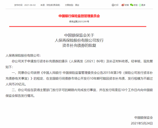6月3日消息,中国银保监会公示关于人保再保险股份有限公司发行资本补充债券的批复。经审核,同意人保再保险依照《中国人民银行 中国保险监督管理委员会公告2015年第3号(保险公司发行资本补充债券有关事宜)》的规定,在全国银行间债券市场公开发行10年期可赎回资本补充债,发行规模为不超过人民币20亿元。