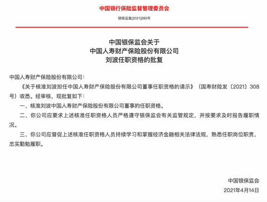 6月3日消息,中国银保监会关于中国人寿(35.780, 0.73, 2.08%)财产保险股份有限公司刘波任职资格的批复显示,经审核,现核准刘波中国人寿财产保险股份有限公司董事的任职资格。