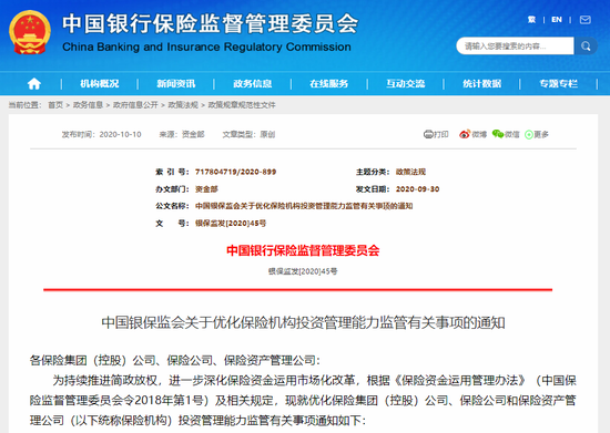 2020年10月,在深化“放管服”改革的背景下,中国银保监会为进一步推进保险资金运用市场化改革,引发《关于优化保险机构投资管理能力监管有关事项的通知》,业内称之为“45号文件”。