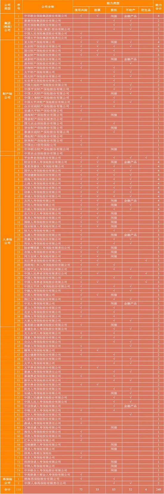 《通报》称,截至2021年3月31日,共有110家保险公司具备不同类型的投资管理能力(包括信用风险管理、股票投资、股权投资、不动产投资和衍生品运用管理等五项能力)合计249项。其中40项能力为45号文件发布后新增,94家保险公司暂未具备任何投资管理能力。