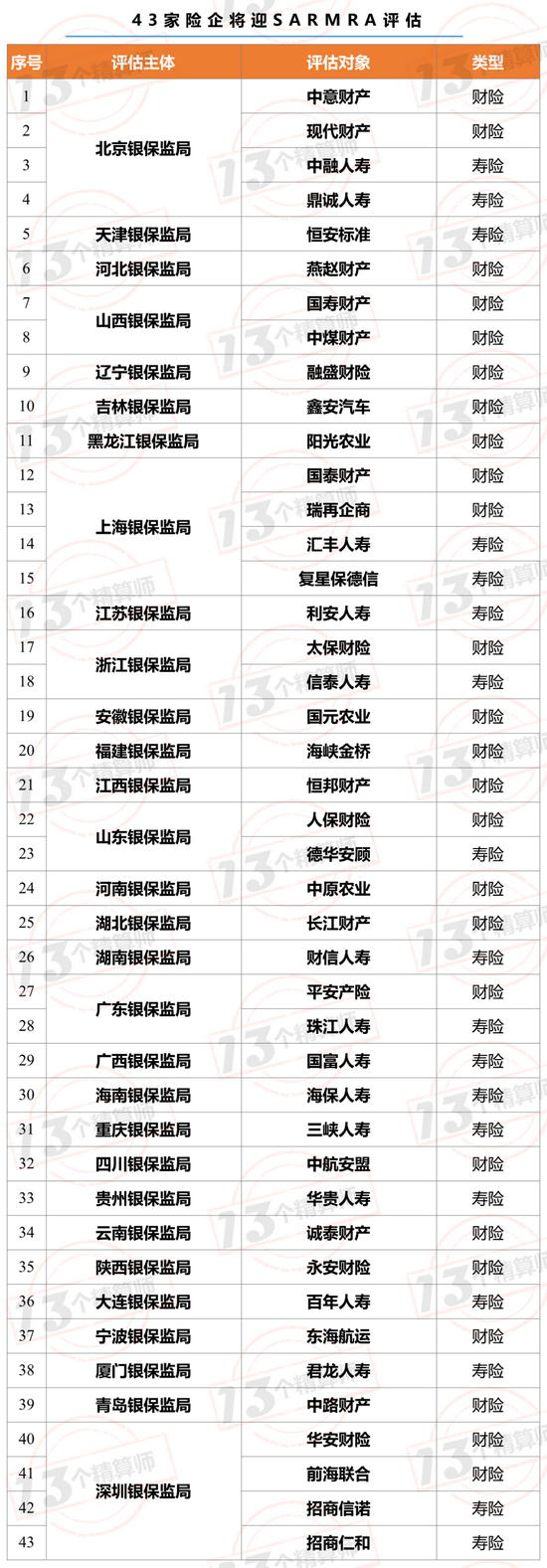 1. 43家险企接受评估:财险25家,寿险18家!