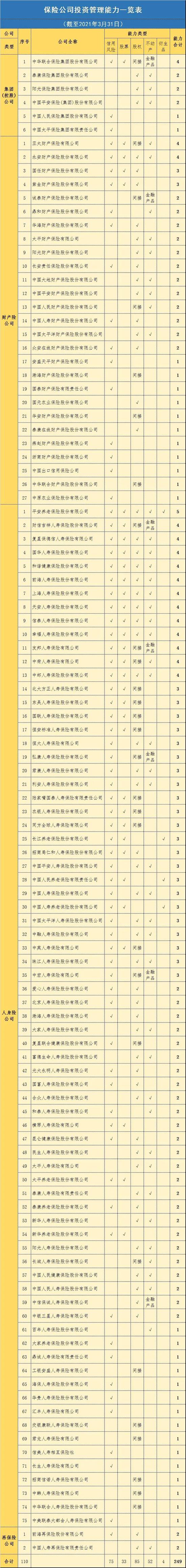 中国保险行业协会近日发布的《保险公司投资管理能力建设情况通报》显示,截至2021年3月31日,共有110家保险公司具备不同类型的投资管理能力(包括信用风险管理、股票投资、股权投资、不动产投资和衍生品运用管理等五项能力)合计249项。其中,40项能力为《关于优化保险机构投资管理能力监管有关事项的通知》文件发布后新增。