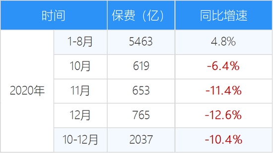 费改后,增速直降15个百分点,2020前8个月,车险同比增速4.8%,九月费改后,去年第四季度,同比负增长10.4%,直降15个百分点。