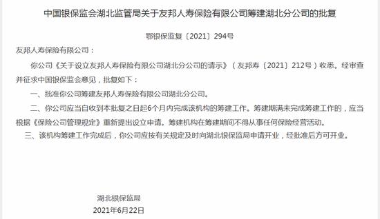 此外,批复指出,友邦人寿应当自收到此批复之日起6个月内完成该机构的筹建工作。