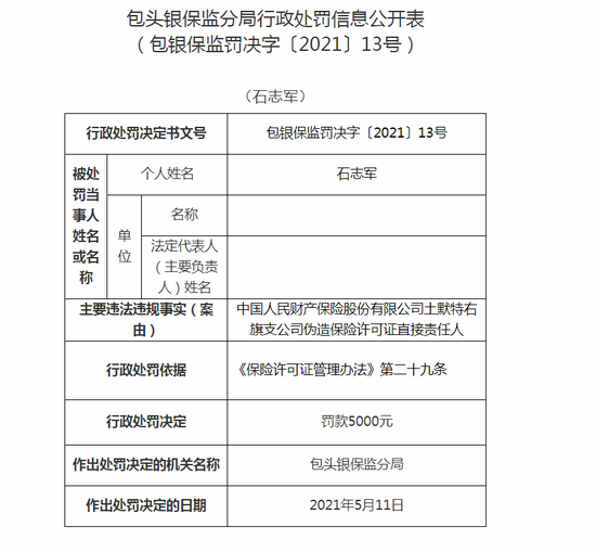此外,石志军为中国人民财产保险股份有限公司土默特右旗支公司伪造保险许可证直接责任人,被罚5000元。