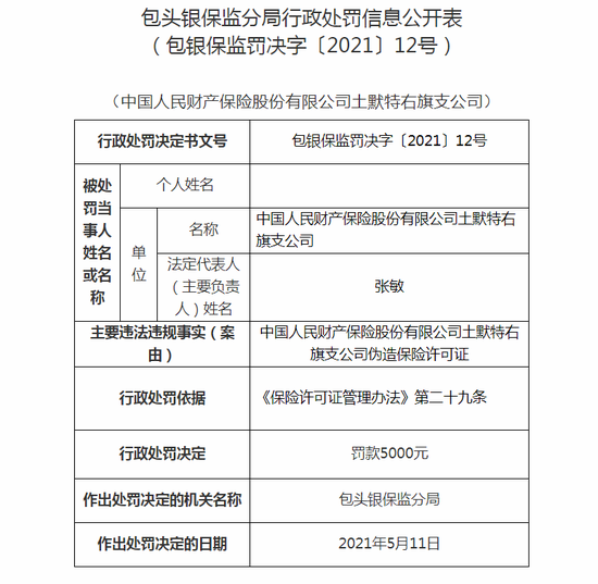 6月24日消息,中国银保监会包头银保监分局行政处罚信息公开表显示,中国人民财产保险股份有限公司土默特右旗支公司因伪造保险许可证,被罚5000元。