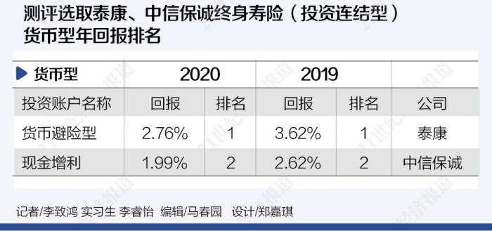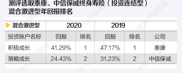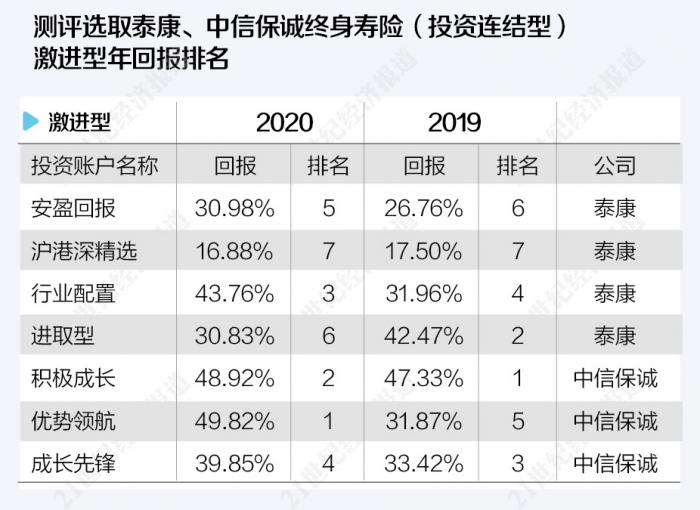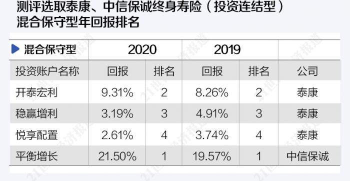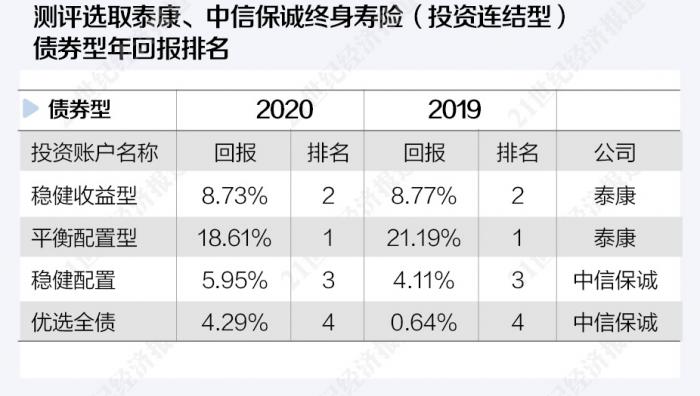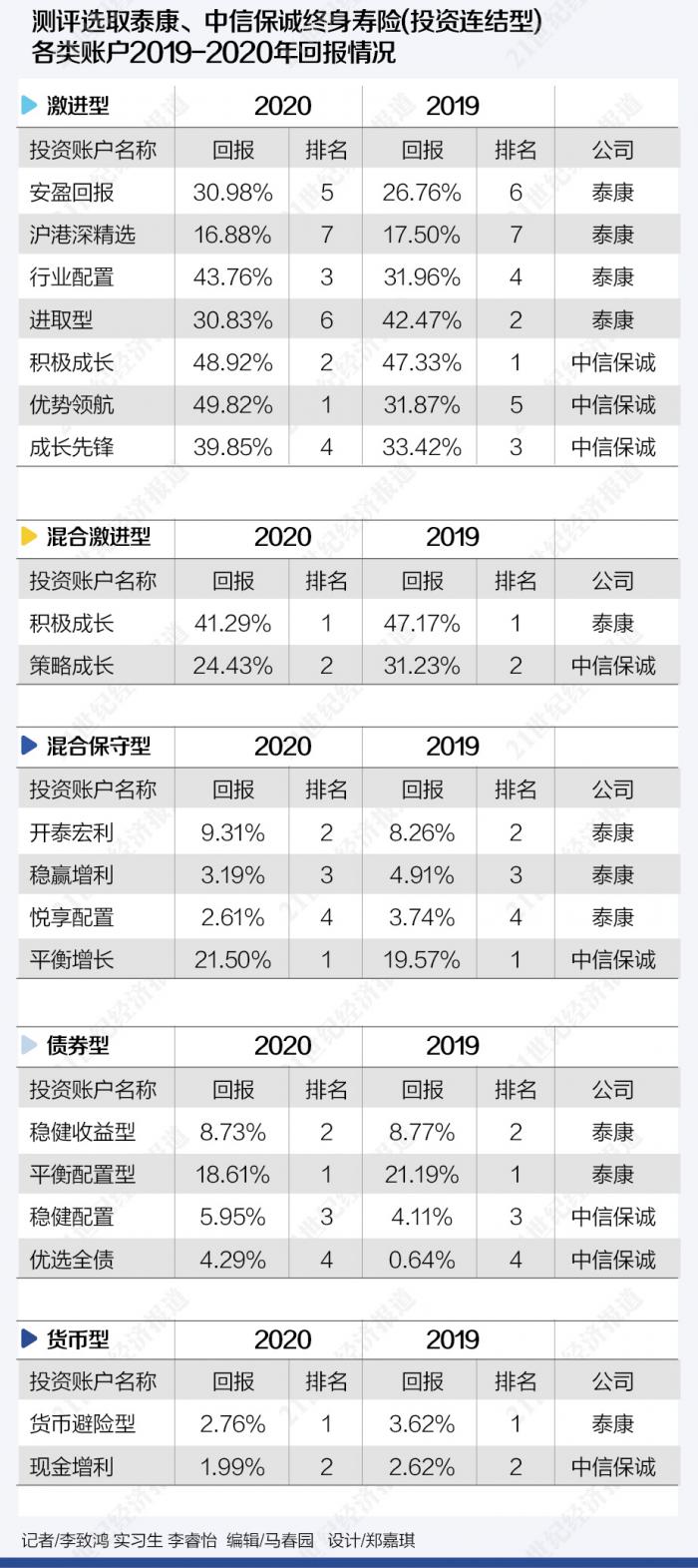 通过21世纪经济报道保险课题组对上述投资账户的比较发现,在激进型中,中信保诚的优势领航账户2020年回报49.82%,位列第一;在混合激进型中,泰康的积极成长账户2020年回报41.29%,位列第一;在混合保守型中,中信保诚的平衡增长账户2020年回报21.50%,位列第一;在债券型中,泰康的平衡配置型账户2020年回报18.61%,位列第一;在货币型中,泰康的货币避险型账户2020年回报2.76%,位列第一。