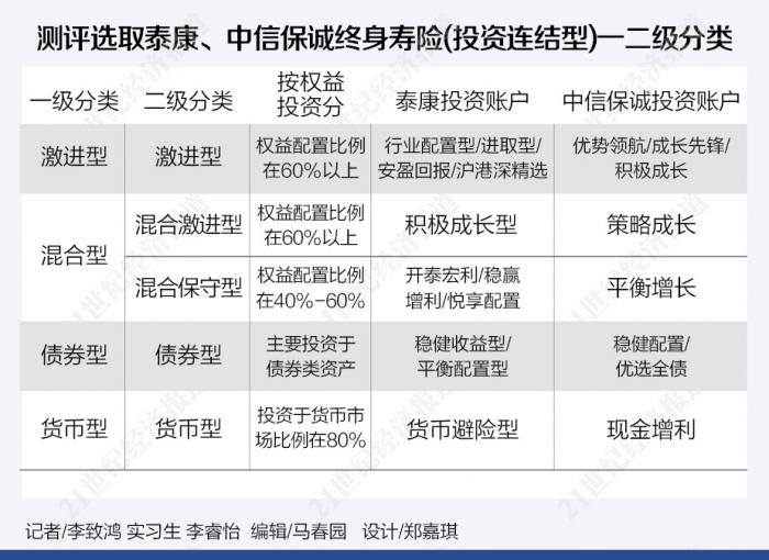 参考华宝证券等市场评价标准和具体产品特征,21世纪经济报道报道保险课题组按照权益资产配置比例,对终身寿险(投连连结型)进行一、二级分类,即投资于权益类资产比例在60%以上的,一、二级分类均为激进型;投资于权益类资产在60%以下的,一级分类为混合型,其中投资于权益类资产比例在40%-60%的,二级分类为混合激进型,投资于权益类资产比例在40%以下的,二级分类为混合保守型;主要投资于债券类资产的,一、二级分类均为债券型;此外,投资于货币市场比例在80%的,一、二级分类均为货币型。