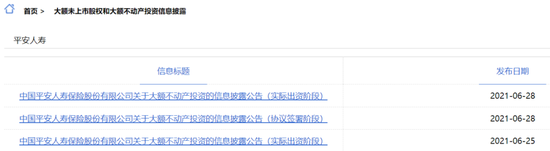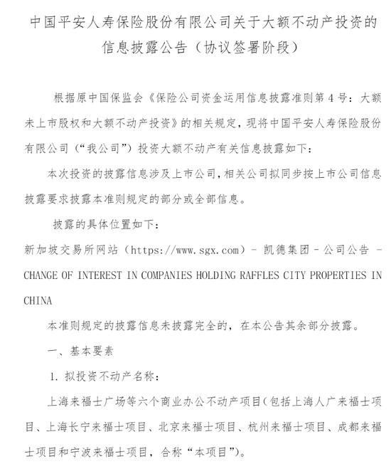 6月28日,平安人寿在中国保险行业协会网站发布关于大额不动产投资的信息披露公告,称拟投资上海来福士广场等六个商业办公不动产项目。公告显示,作为投资主体,平安人寿以直接持有各项目公司部分股权方式投资不动产,投资金额预计不超过330亿元。目前,此交易正处于协议签署阶段。
