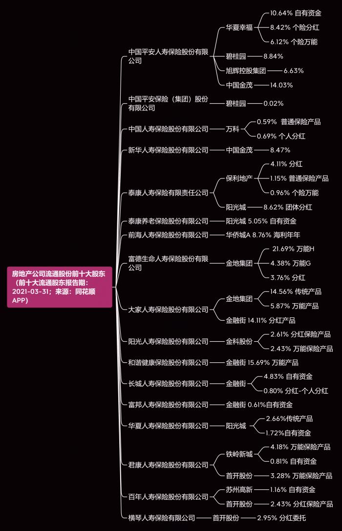 21世纪经济报道保险课题组根据同花顺(106.320, 2.18, 2.09%)数据统计,截至报告期2021年3月31日,A股市场房地产板块124家上市公司中,前十大流通股东中共有13家出现保险资金身影。