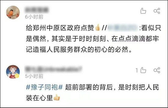 回到河南郑州,网友纷纷留言给中原区政府点赞。“超前部署的背后,是时刻把人民装在心里。”“看似只是偶然,其实是于时时刻刻都牢记造福人民、服务群众的初心的必然。”