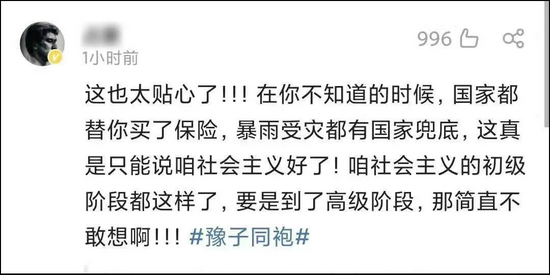 “这也太贴心了,”一网友留言说,“在你不知道的时候,国家都替你买了保险,暴雨受灾都有国家兜底。”