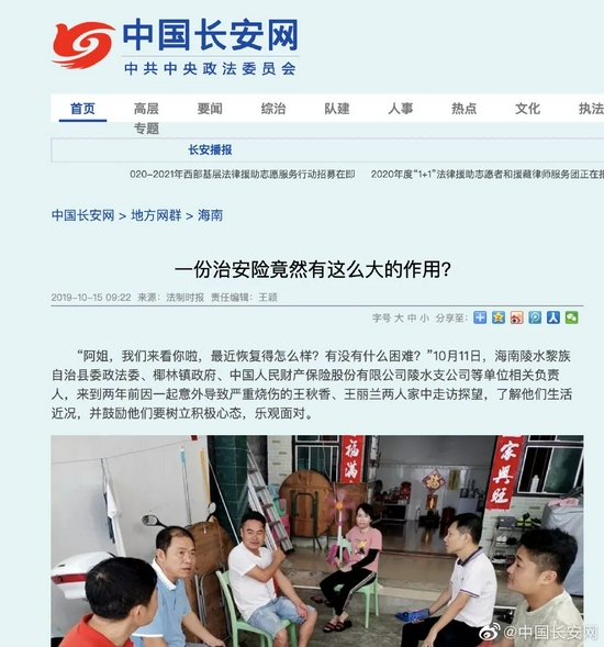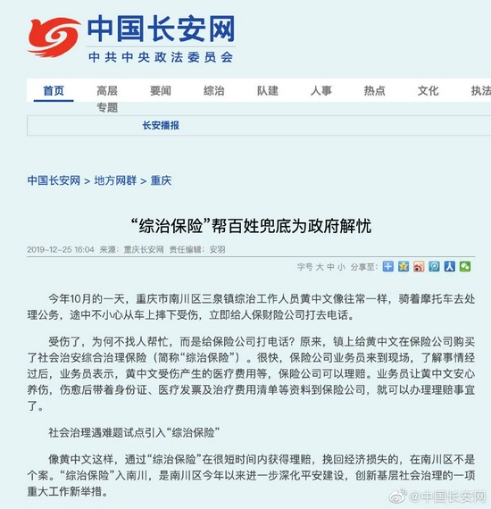 中国长安网称,近年山东、福建、江苏、重庆、海南等多地都推出了这一创新举措,名称不同,有的叫综治保险,有的叫社会治安保险。但在意外发生时,都能够帮百姓兜底。长安网玩起谐音梗:“‘综治保险’=总之保险!愿你在我看不到的地方安然无恙。”