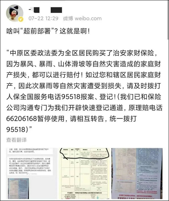 根据中国长安网发布的中原区政法委人士朋友圈截图,有了这份保险,全区居民因为暴风、暴雨、山体滑坡等自然灾害造成的家庭财产损失,都可以进行赔付。“只要爱在,希望就在;只要爱在,我们都能挺过去。”