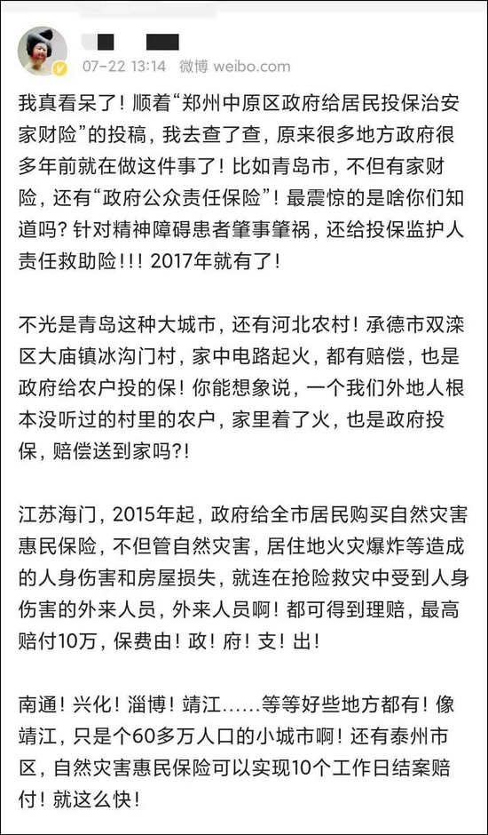 例如青岛市不但给居民买家财险,还有“政府公众责任保险”。河北承德市农村,家中电路起火都有赔偿,也是政府给农户投的保。