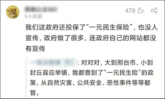 网友留言表示,当地政府也投了“一元民生保险”,也没人宣传,政府做了很多,连政府自己的网站都没有宣传。博主称,邢台市、封丘县应举镇等,都查到了“一元民生险”的政策,自然灾害、公共安全、恶性事件等都管。