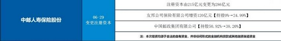 若完成注册资本变更,中邮人寿则是其中新增注册资本最多的保险公司。目前,邮政系4家公司对中邮人寿持股比例分别为中国邮政集团有限公司50.92%、北京中邮资产管理有限公司持股20%、中国集邮有限公司16.25%、邮政科学研究规划院有限公司12.83%。此次友邦保险拟出资120.34亿元,全部认购中邮人寿增发的71.63亿股,持股比例为增资后中邮保险股权比例的24.99%。