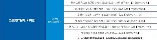 三星财险若完成注册资本变更,将是其中新增股东最多的保险公司。其中,深圳市腾讯网域计算机网络有限公司增资约2.8亿元,持有股份比例为32%;宇星科技发展(深圳)有限公司和曼巴特(张家港)投资发展有限公司均增资约1亿元,持有股份比例均为11.5%;博裕三期(上海)股权投资合伙企业和安徽国海投资发展有限公司均增资约0.35亿元,持股比例均为4%;原股东韩国三星火灾海上保险公司持股比例降至37%。