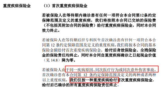 “若被保险人由于同一疾病原因、同次医疗行为或同次意外伤害事故,首次确诊患有本合同约定保障范围及定义的两种或者两种以上重度疾病,我们仅按一种重度疾病给付首次重度疾病保险金,给付后已确诊的所有重度疾病保险责任终止。”