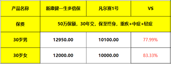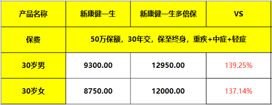 所以从保费上而言,多倍保要比新康健一生高出30%-40%。