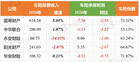 2020年,中华、大地、国寿财、阳光、太平几家百亿规模的公司,车险承保利润大幅下滑,累计亏损15.2亿,2019年这个数字则是盈利13.9亿。
