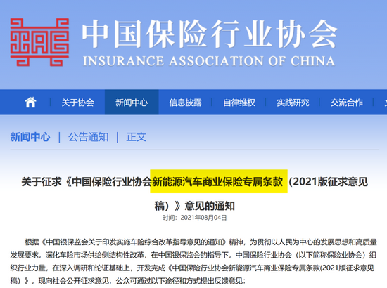 今天,中保协下发中国保险行业协会新能源汽车商业保险专属条款(2021版征求意见稿)》,面向社会公开征求意见。