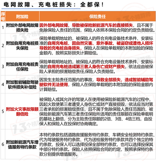 这6个附加险,不仅包含外部电网故障损失,还包括自用充电桩损失,以及其导致的责任等。