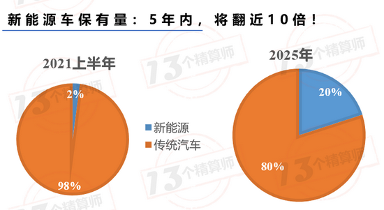 这也就意味着,未来5年内,新能源车的保有量将翻近10倍。