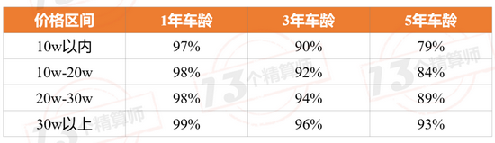 下表为不同价位的9座以下纯电动车新车购置价,按照新能源车条款折旧率下净值,与现在商车险条款折旧率下净值的比值。