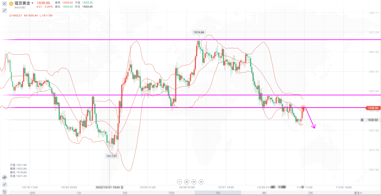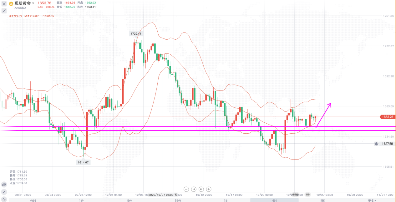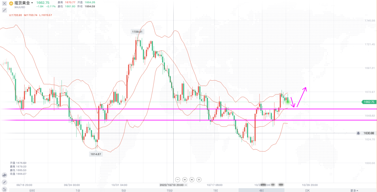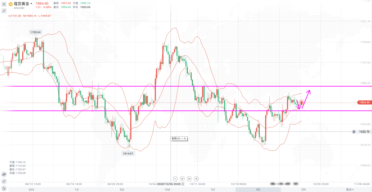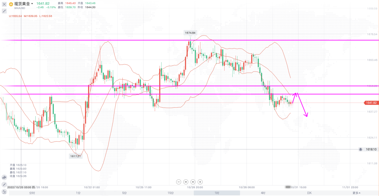 黄金价格本周整体波动不大,因为即将公布利率决议的原因,市场也比较谨慎,也在观望。日线级别,布林带收口,价格在上月跌破布林中轨之后,始终保持在中轨下方宽幅震荡,中途价格虽然几次向上试探,并未突破中轨一线阻力,而日内需要关注的就是上方布林中轨一线阻力,也就是1658-1660位置。4小时,布林带收口,价格突破中轨阻力小幅反弹,不过预期反弹力度不过太大,日内价格小幅反弹后或将再度回撤,日内操作思路上暂时以反弹高空为主,上方关注1658-1660区域阻力。