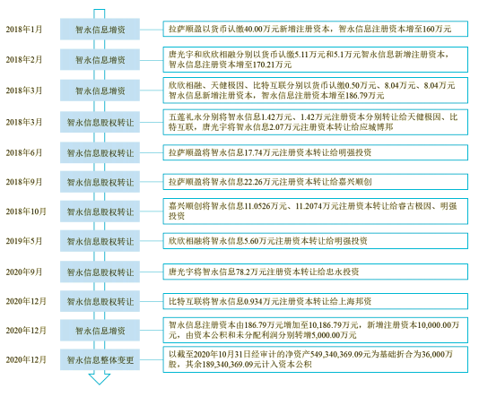 2020年12月,智永信息再次增资,由186.79万元增至1.02亿元,并再次进行股权变动,2020年12月30日,智永信息整体变更为宝宝巴士股份有限公司。